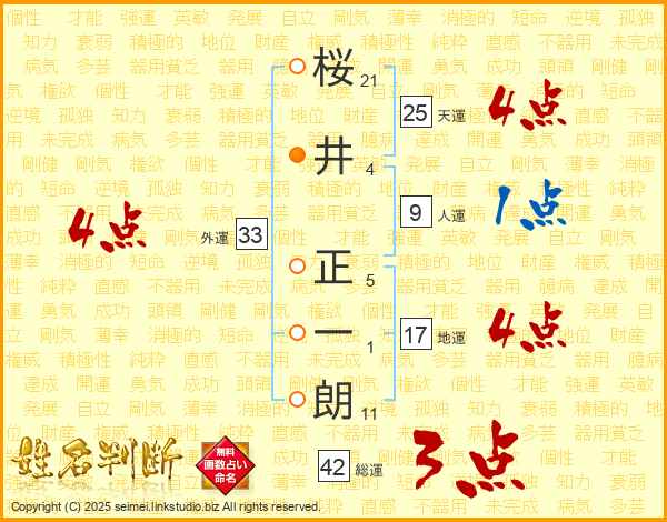 桜(21画)井(4画) 正(5画)一(1画)朗(11画)
