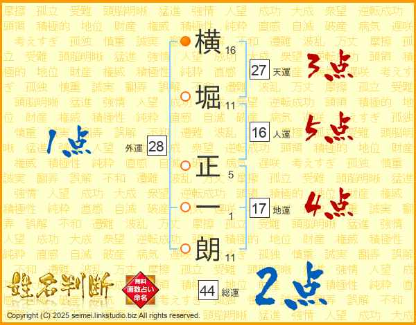 横(16画)堀(11画) 正(5画)一(1画)朗(11画)