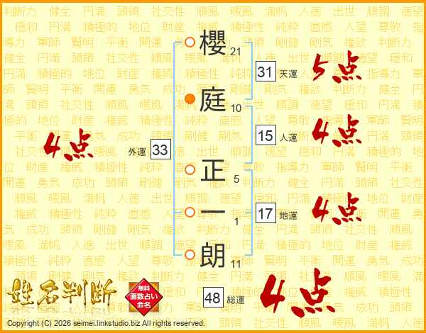 櫻(21画)庭(10画) 正(5画)一(1画)朗(11画)