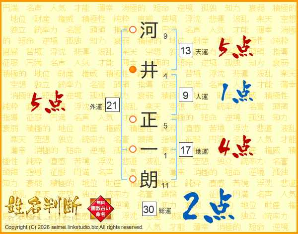 河(9画)井(4画) 正(5画)一(1画)朗(11画)