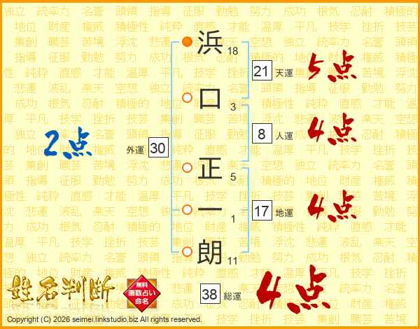 浜(18画)口(3画) 正(5画)一(1画)朗(11画)