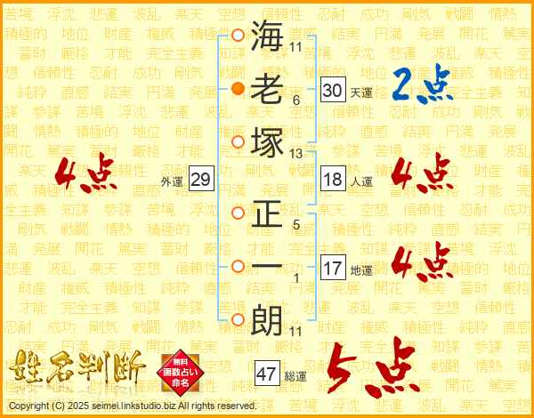 海(11画)老(6画)塚(13画) 正(5画)一(1画)朗(11画)