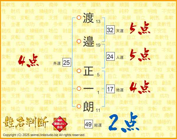 渡(13画)邉(19画) 正(5画)一(1画)朗(11画)