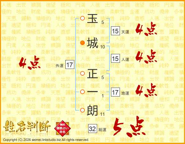 玉(5画)城(10画) 正(5画)一(1画)朗(11画)