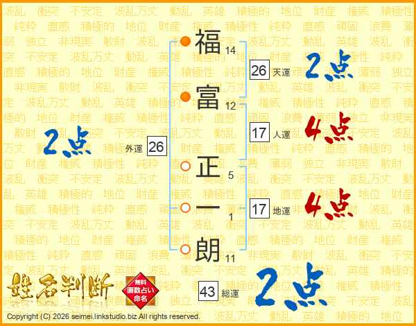 福(14画)富(12画) 正(5画)一(1画)朗(11画)