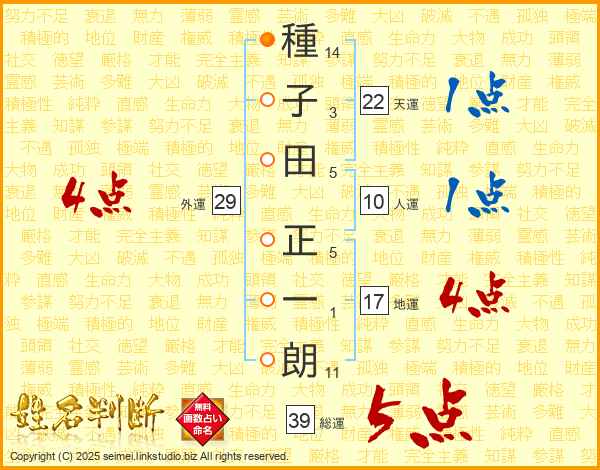 種(14画)子(3画)田(5画) 正(5画)一(1画)朗(11画)