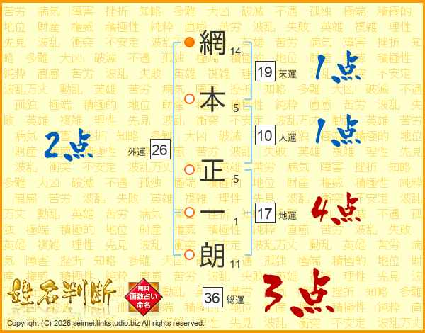 網(14画)本(5画) 正(5画)一(1画)朗(11画)