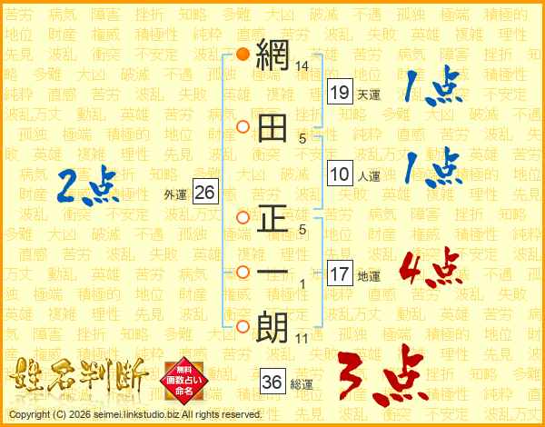 網(14画)田(5画) 正(5画)一(1画)朗(11画)