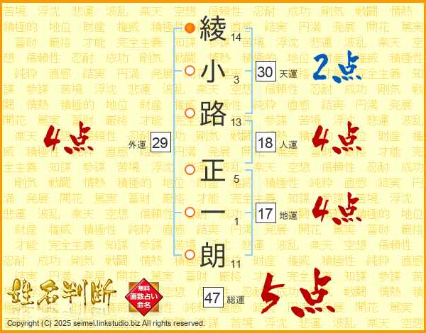 綾(14画)小(3画)路(13画) 正(5画)一(1画)朗(11画)