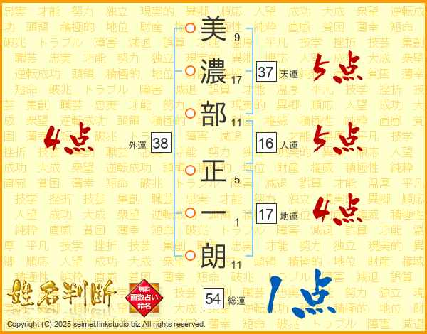 美(9画)濃(17画)部(11画) 正(5画)一(1画)朗(11画)
