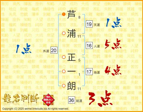 芦(8画)浦(11画) 正(5画)一(1画)朗(11画)