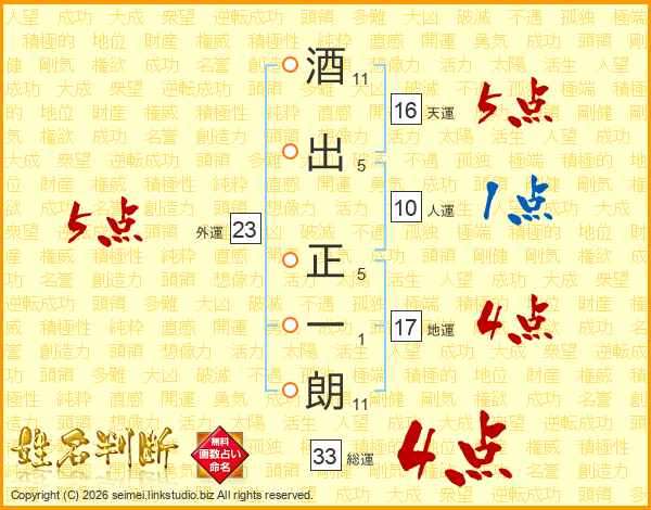 酒(11画)出(5画) 正(5画)一(1画)朗(11画)