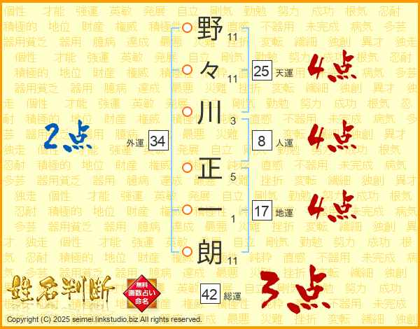 野(11画)々(11画)川(3画) 正(5画)一(1画)朗(11画)