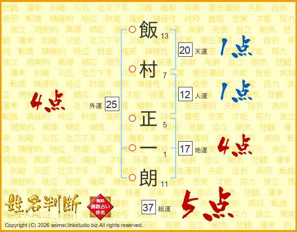 飯(13画)村(7画) 正(5画)一(1画)朗(11画)