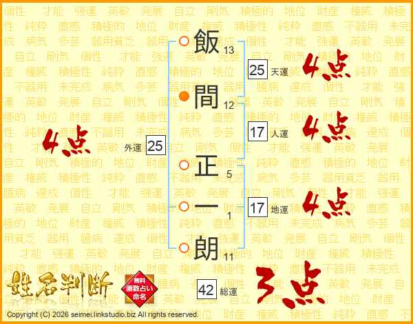 飯(13画)間(12画) 正(5画)一(1画)朗(11画)