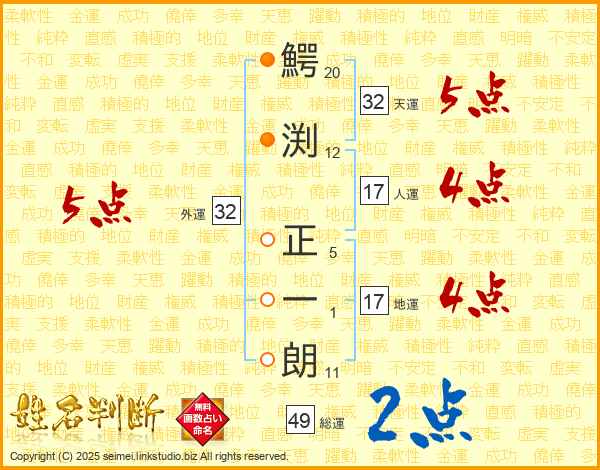 鰐(20画)渕(12画) 正(5画)一(1画)朗(11画)