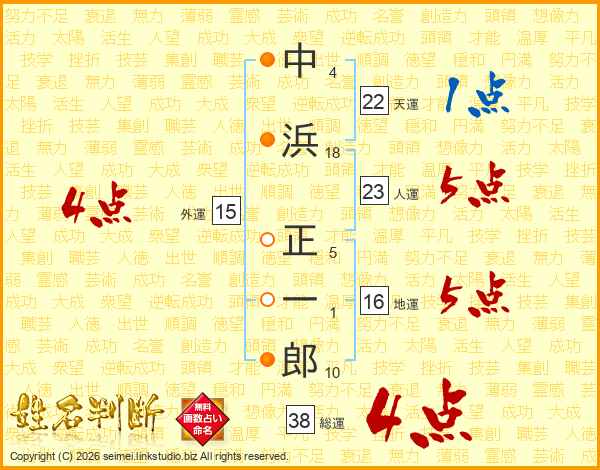 中(4画)浜(18画) 正(5画)一(1画)郎(10画)