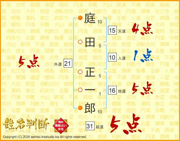 庭(10画)田(5画) 正(5画)一(1画)郎(10画)