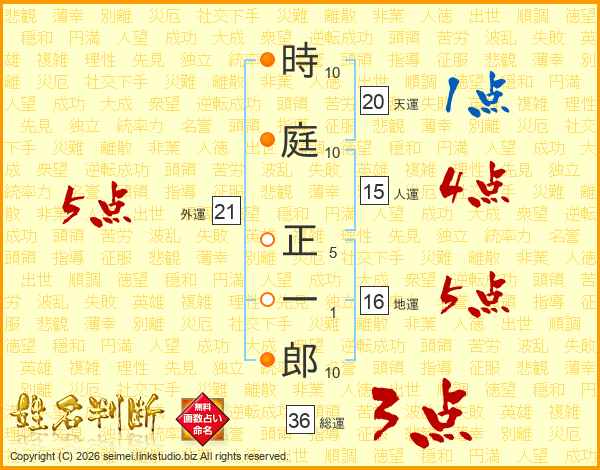 時(10画)庭(10画) 正(5画)一(1画)郎(10画)