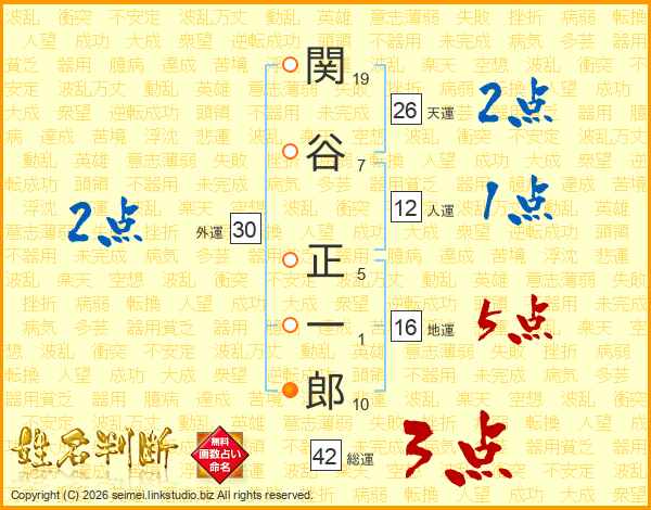 関(19画)谷(7画) 正(5画)一(1画)郎(10画)
