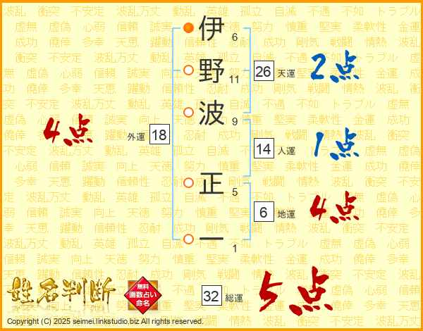 伊(6画)野(11画)波(9画) 正(5画)一(1画)