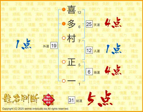 喜(12画)多(6画)村(7画) 正(5画)一(1画)