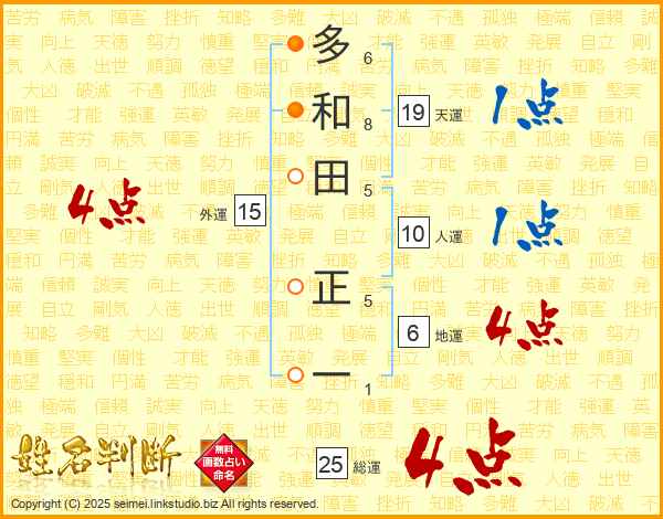 生活面を象徴する運勢です。外部から受ける影響力を表し、結婚運、家庭運や職場、環境への順応性を表します。総運から人運を引いた画数。姓や名が1文字の場合を除く。