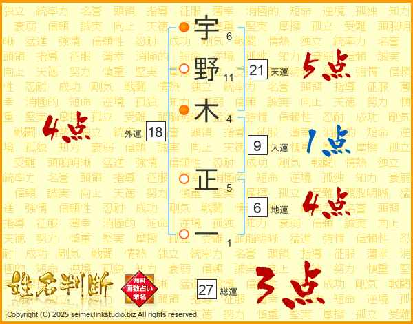 宇(6画)野(11画)木(4画) 正(5画)一(1画)