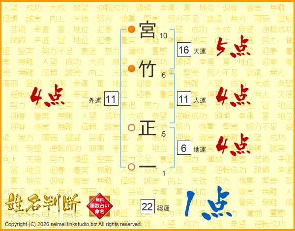 生活面を象徴する運勢です。外部から受ける影響力を表し、結婚運、家庭運や職場、環境への順応性を表します。総運から人運を引いた画数。姓や名が1文字の場合を除く。
