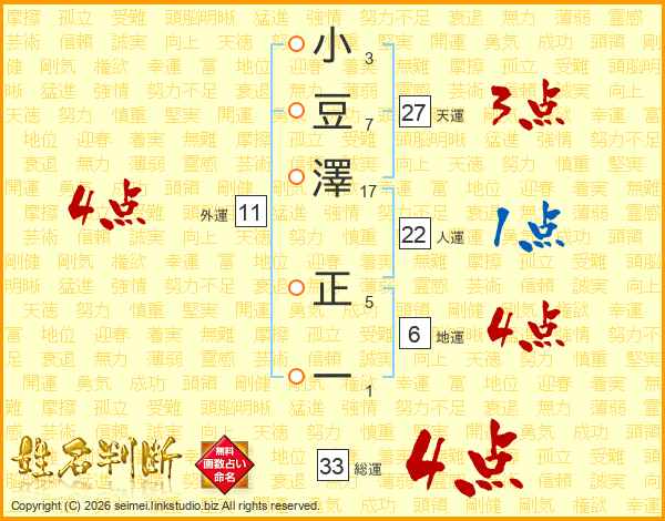 小(3画)豆(7画)澤(17画) 正(5画)一(1画)