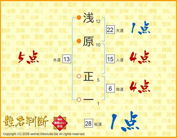 あなたの人生を表す1番重要な運勢です。生涯を通じて影響する総合運となり、主に50歳以降の晩年期に影響を及ぼします。苗字と名前の合計画数。