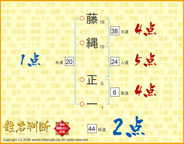 あなたの人生を表す1番重要な運勢です。生涯を通じて影響する総合運となり、主に50歳以降の晩年期に影響を及ぼします。苗字と名前の合計画数。