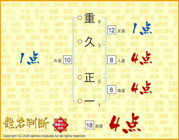 生活面を象徴する運勢です。外部から受ける影響力を表し、結婚運、家庭運や職場、環境への順応性を表します。総運から人運を引いた画数。姓や名が1文字の場合を除く。