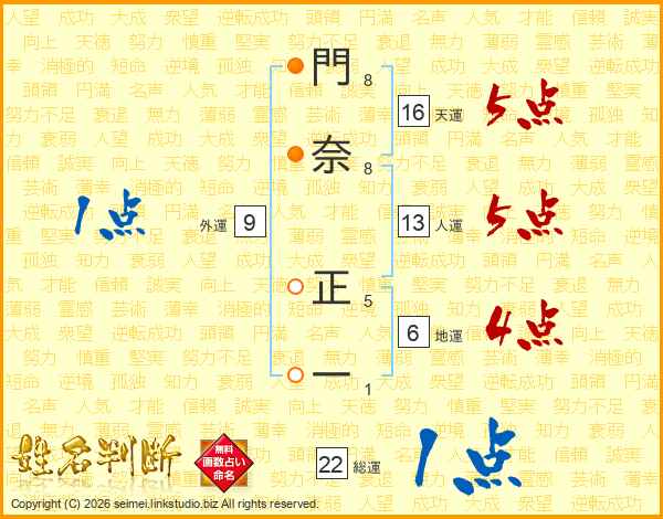 画数の奇数(○陽)と偶数(●陰)の配列で吉凶を占います。どちらかにかたよる名前は大凶名で避ける必要があります。画数の奇数偶数。