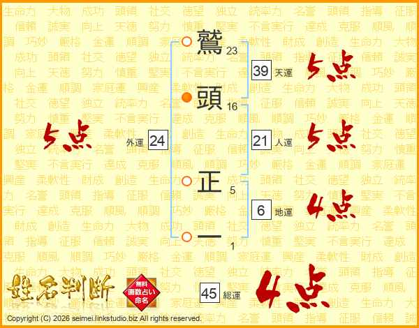 あなたの人生を表す1番重要な運勢です。生涯を通じて影響する総合運となり、主に50歳以降の晩年期に影響を及ぼします。苗字と名前の合計画数。