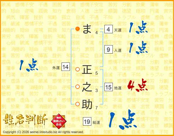 生活面を象徴する運勢です。外部から受ける影響力を表し、結婚運、家庭運や職場、環境への順応性を表します。総運から人運を引いた画数。姓や名が1文字の場合を除く。