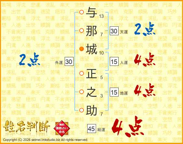 生活面を象徴する運勢です。外部から受ける影響力を表し、結婚運、家庭運や職場、環境への順応性を表します。総運から人運を引いた画数。姓や名が1文字の場合を除く。
