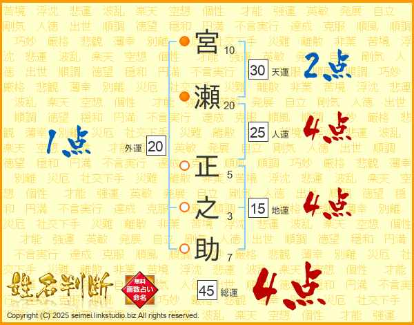 宮(10画)瀬(20画) 正(5画)之(3画)助(7画)