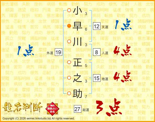小(3画)早(6画)川(3画) 正(5画)之(3画)助(7画)