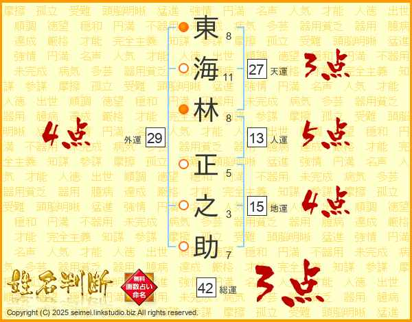 東(8画)海(11画)林(8画) 正(5画)之(3画)助(7画)