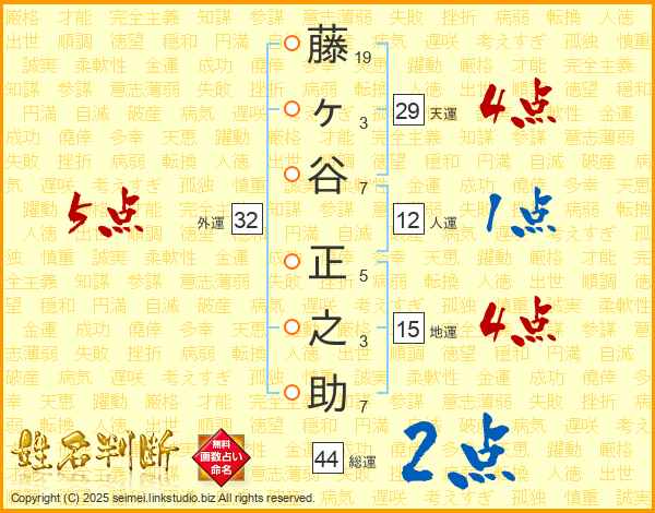藤(19画)ヶ(3画)谷(7画) 正(5画)之(3画)助(7画)