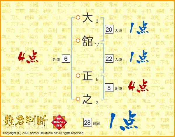 あなたの人生を表す1番重要な運勢です。生涯を通じて影響する総合運となり、主に50歳以降の晩年期に影響を及ぼします。苗字と名前の合計画数。