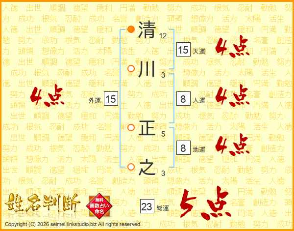 清川正之さんの総運は23画の5点!