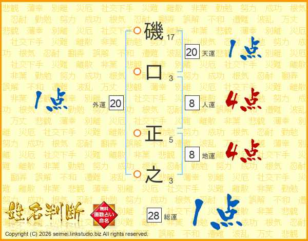 生活面を象徴する運勢です。外部から受ける影響力を表し、結婚運、家庭運や職場、環境への順応性を表します。総運から人運を引いた画数。姓や名が1文字の場合を除く。