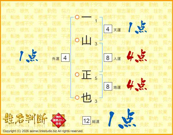 生活面を象徴する運勢です。外部から受ける影響力を表し、結婚運、家庭運や職場、環境への順応性を表します。総運から人運を引いた画数。姓や名が1文字の場合を除く。