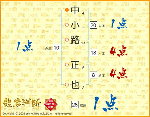 生活面を象徴する運勢です。外部から受ける影響力を表し、結婚運、家庭運や職場、環境への順応性を表します。総運から人運を引いた画数。姓や名が1文字の場合を除く。