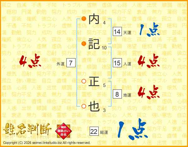 生活面を象徴する運勢です。外部から受ける影響力を表し、結婚運、家庭運や職場、環境への順応性を表します。総運から人運を引いた画数。姓や名が1文字の場合を除く。