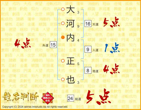 大(3画)河(9画)内(4画) 正(5画)也(3画)