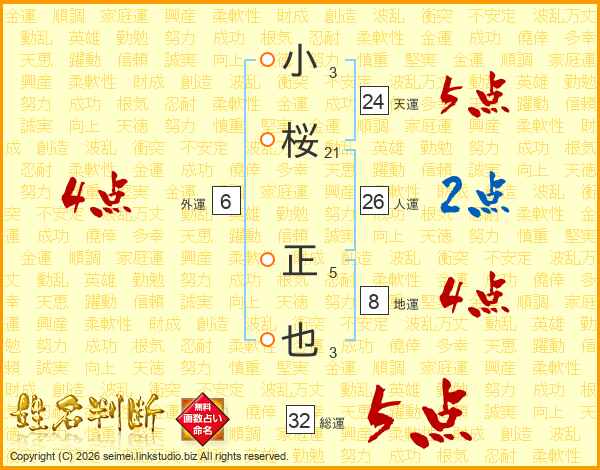 生活面を象徴する運勢です。外部から受ける影響力を表し、結婚運、家庭運や職場、環境への順応性を表します。総運から人運を引いた画数。姓や名が1文字の場合を除く。
