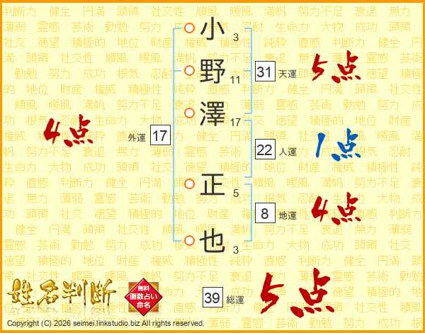 小野澤正也さんの総運は39画の5点!